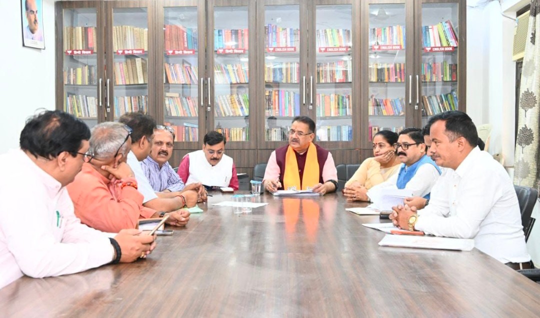 दिल्ली के बीजेपी चुनाव कार्यालय में विधानसभा प्रवासी और विधानसभा संयोजको संग बैठक करते कैबिनेट मंत्री गणेश जोशी।