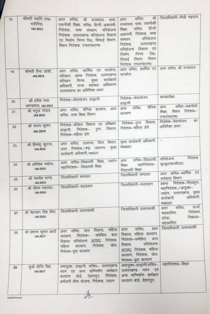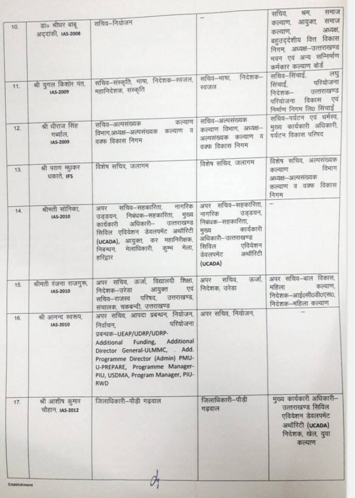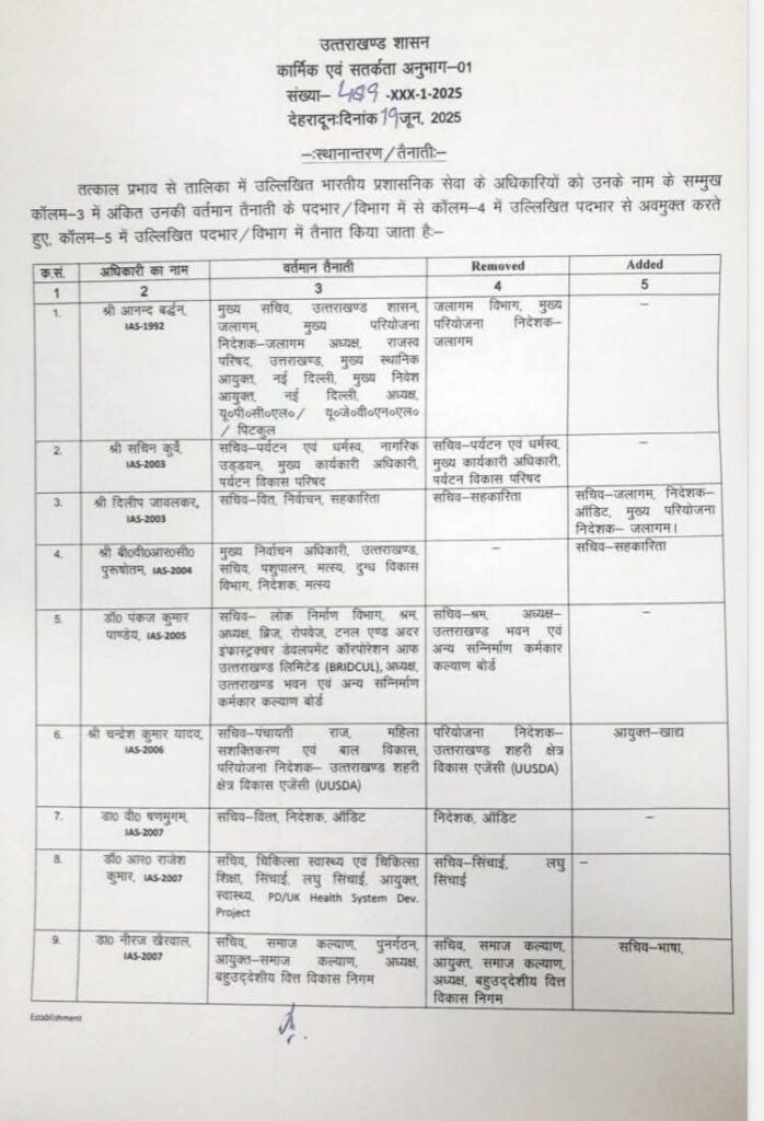 रुद्रप्रयाग के जिलाधिकारी सौरभ गहरवार को प्रबंध निदेशक सिडकुल व महानिदेशक उद्योग बनाया गया है। उनकी जगह एमडी सिडकुल प्रतीक जैन को रुद्रप्रयाग का डीएम बनाया गया है। उत्तरकाशी के डीएम मेहरबान सिंह बिष्ट को अपर सचिव ऊर्जा, सहकारिता व निदेशक उरेडा की जिम्मेदारी सौंपी गई है, उनकी जगह अपर सचिव बाल विकास व निदेशक खेल प्रशांत कुमार आर्या को जिलाधिकारी उत्तरकाशी की जिम्मेदारी सौंपी गई है।इनके महकमे भी बदलेमुख्य सचिव आनंद बर्द्धन को जलागम विभाग से मुक्त कर दिया गया है। आईएएस सचिन कुर्वे से सचिव पर्यटन, सीईओ पर्यटन विकास परिषद की जिम्मेदारी ले ली गई है। सचिव वित्त दिलीप जावलकर से सहकारिता हटाते हुए जलागम विभाग दिया गया है। सचिव पशुपालन एवं मुख्य निर्वाचन अधिकारी डॉ. बीवीआरसी पुरुषोत्तम को सहकारिता विभाग सौंपा गया है। सचिव लोक निर्माण विभाग डॉ. पंकज पांडे से श्रम विभाग हटा दिया गया है। सचिव पंचायती राज चंद्रेश यादव से शहरी क्षेत्र विकास एजेंसी हटाकर आयुक्त खाद्य की जिम्मेदारी सौंपी गई है। सचिव वित्त डॉ.वी षणमुगम से निदेशक ऑडिट की जिम्मेदारी हटा दी गई है। सचिव स्वास्थ्य डॉ. आर राजेश कुमार से सिंचाई और लघु सिंचाई हटा दिया गया।वहीं, सचिव डॉ. नीरज खैरवाल से समाज कल्याण विभाग हटाते हुए भाषा विभाग की जिम्मेदारी दी गई है। सचिव नियोजन श्रीधर बाबू अद्दांकी को समाज कल्याण और श्रम विभाग सौंपा गया है। सचिव युगल किशोर पंत से भाषा और स्वजल हटाते हुए उन्हें सिंचाई, लघु सिंचाई दिया गया है। सचिव धीराज सिंह गर्ब्याल से अल्पसंख्यक कल्याण हटाते हुए पर्यटन की जिम्मेदारी दी गई है। आईएफएस पराग मधुकर धकाते से जलागम हटाते हुए उन्हें विशेष सचिव अल्पसंख्यक कल्याण बनाया गया है। अपर सचिव सोनिका से सहकारिता, नागरिक उड्डयन, सीईओ यूकाडा की जिम्मेदारी हटा दी गई है। अपर सचिव विद्यालयी शिक्षा रंजना राजगुरू से ऊर्जा हटाते हुए बाल विकास एवं महिला कल्याण की जिम्मेदारी सौंपी गई है।वहीं, अपर सचिव आपदा प्रबंधन आनंद स्वरूप से नियोजन विभाग हटाया गया है। अपर सचिव रीना जोशी से कार्मिक हटाते हुए अपर सचिव राज्यपाल की जिम्मेदारी दी गई है। आईएएस हरीश चंद्र कांडपाल से निदेशक सेवायोजन हटाते हुए बाध्य प्रतीक्षा में रखा गया है। अपर सचिव मनुज गोयल से सैनिक कल्याण हटाते हुए उन्हें तकनीकी शिक्षा और मिशन निदेशक एनएचएम की जिम्मेदारी दी गई है। निदेशक कौशल विकास संजय कुमार से दुग्ध विकास और महिला डेरी हटाते हुए उन्हें निदेशक सेवायोजन का अतिरिक्त प्रभार दिया गया है।अपर सचिव हिमांशु खुराना से पीएमजीएसवाई के सीईओ की जिम्मेदारी वापस ली गई है। अपर सचिव पर्यटन अभिषेक रुहेला से शिक्षा हटाते हुए शहरी क्षेत्र विकास एजेंसी