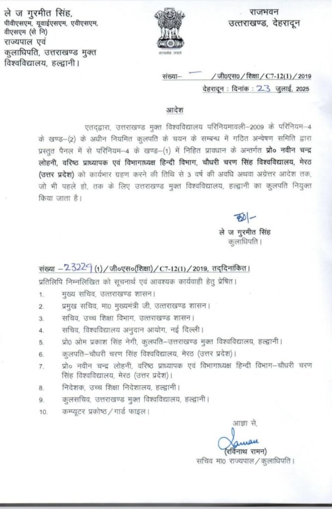 उत्तराखण्ड मुक्त विश्वविद्यालय को नया कुलपति मिल गया है। राज्यपाल गुरमीत सिंह ने प्रोफेसर नवीन चन्द्र लोहनी को कुलपति नियुक्त किया है। प्रो. लोहनी वर्तमान में चौधरी चरण सिंह विश्वविद्यालय मेरठ में हिन्दी विभाग के विभागाध्यक्ष हैं। उन्हें तीन वर्ष की अवधि के लिए यूओयू हल्द्वानी का कुलपति नियुक्त किया गया है। शिक्षा जगत में प्रो. लोहनी को शैक्षिक प्रशासक के रूप में जाना जाता है।
