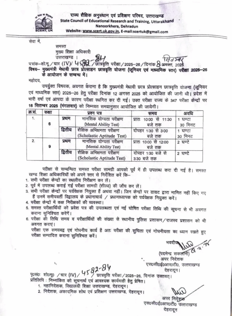 उपर्युक्त विषयक, अवगत कराना है कि मुख्यमंत्री मेधावी छात्र प्रोत्साहन छात्रवृत्ति योजना (जूनियर एवं माध्यमिक स्तर) 2025-26 हेतु परीक्षा दिनांक 12 अगस्त 2025 को आयोजित की जानी थी। प्रदेश में भारी वर्षा एवं आपदा के कारण परीक्षा स्थगित कर दी गई। उक्त परीक्षा राज्य के 347 परीक्षा केन्द्रों पर 16 सितम्बर 2025 (मंगलवार) को निम्नवत समयानुसार आयोजित की जायेगी।