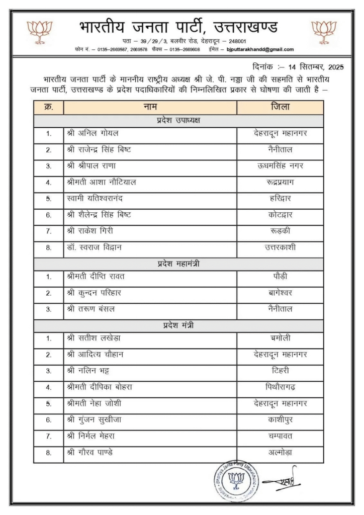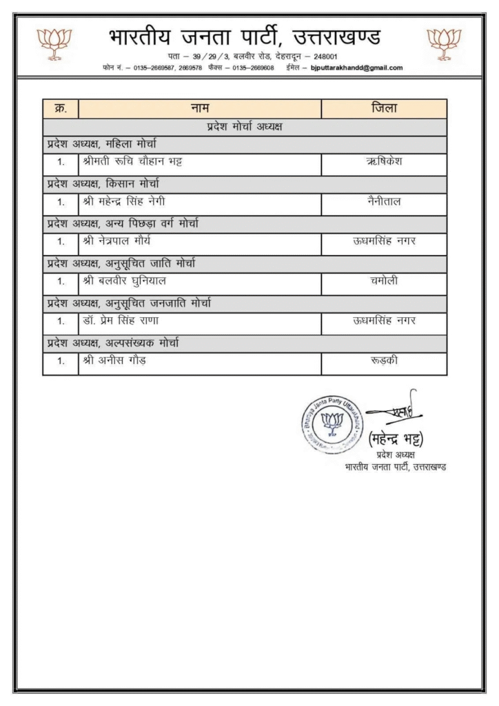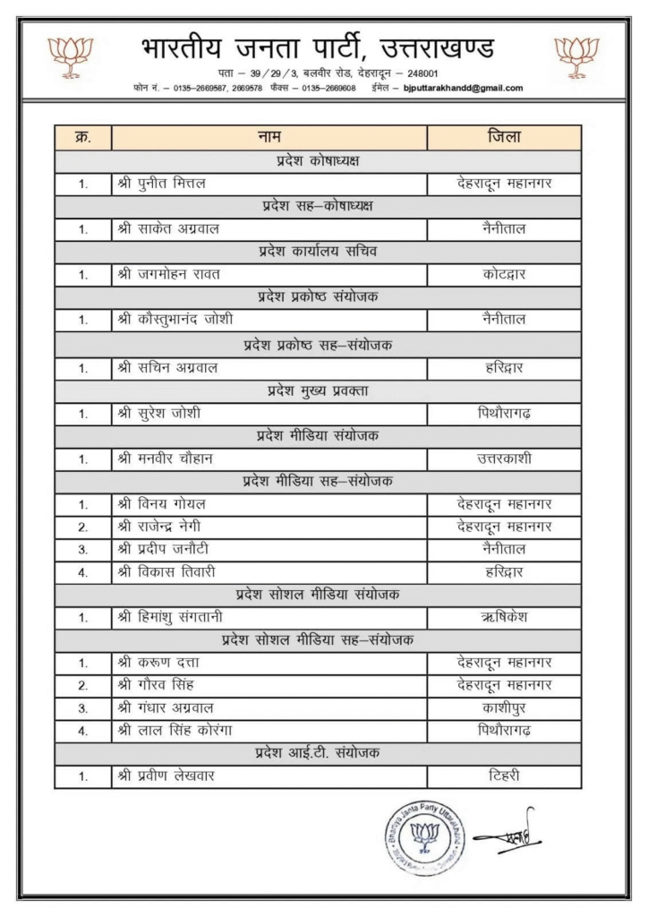 ये है नई टीमप्रदेश उपाध्यक्ष : अनिल गोयल, राजेंद्र बिष्ट, श्रीपाल राणा, आशा नौटियाल, स्वामी यतीश्वरानंद, शैलेंद्र सिंह बिष्ट, राकेश गिरी, डॉ.स्वराज विद्वान।प्रदेश महामंत्री : दीप्ति रावत, कुंदर परिहार, तरूण बंसल।प्रदेश मंत्री : सतीश लखेड़ा, आदित्य चौहान, नलिन भट्ट, दीपिका बोहरा, नेहा जोशी, गुंजन सुखीजा, निर्मल मेहरा, गौरव पांडे।मोर्चा अध्यक्ष : महिला मोर्चा की रूचि चौहान भट्ट, किसान मोर्चा के महेंद्र सिंह नेगी, अन्य पिछड़ा वर्ग मोर्चा के नेत्रपाल मौर्य, अनुसूचित जाति मोर्चा के बलवीर घुनियाल, अनुसूचित जनजाति मोर्चा के डॉ.प्रेम सिंह राणा, अल्पसंख्यक मोर्चा के अनीस गौड़।ये भी पदाधिकारीप्रदेश कोषाध्यक्ष पुनीत मित्तल, प्रदेश सह-कोषाध्यक्ष साकेत अग्रवाल, प्रदेश कार्यालय सचिव जगमोहन रावत, प्रदेश प्रकोष्ठ संयोजक कौस्तुभानंद जोशी, प्रदेश प्रकोष्ठ सह-संयोजक सचिन अग्रवाल, प्रदेश मुख्य प्रवक्ता सुरेश जोशी, प्रदेश मीडिया संयोजक मनवीर चौहान, प्रदेश मीडिया सह-संयोजक विनय गोयल, राजेंद्र नेगी, प्रदीप जनौटी व विकास तिवारी, प्रदेश सोशल मीडिया संयोजक हिमांशु सगतानी, प्रदेश सोशल मीडिया सह-संयोजक करुण दत्ता, गौरव सिंह, गंधार अग्रवाल व लाल सिंह कोरंगा और प्रदेश आईटी संयोजक प्रवीण लेखवार को चुना गया है।