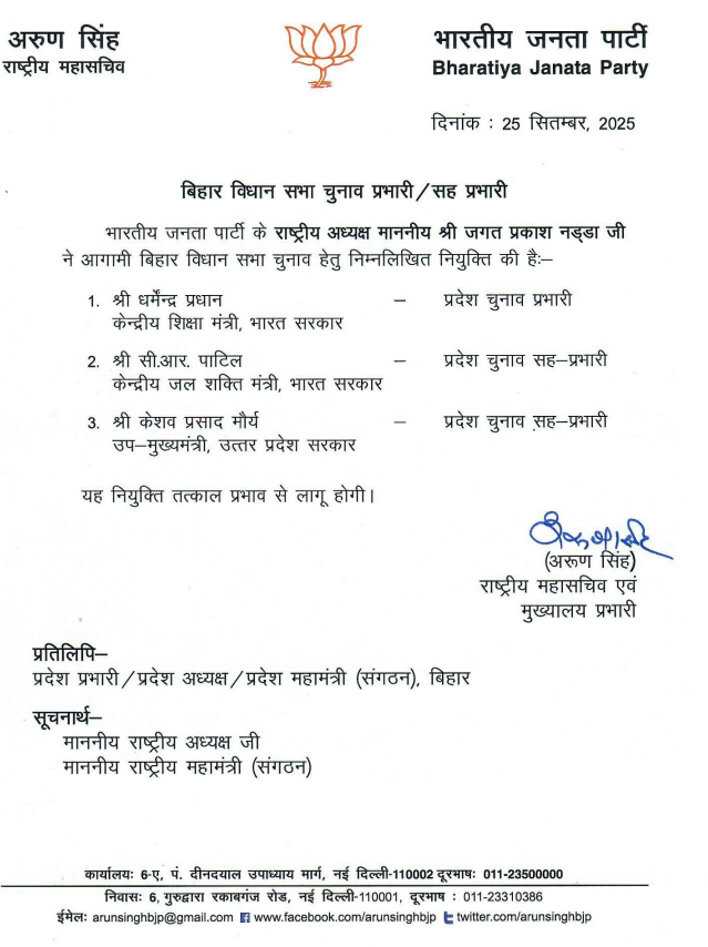 बता दें कि बीजेपी के राष्ट्रीय महासचिव अरुण सिंह की ओर से जारी किए गए पत्र के जरिए इन तीन राज्यों में चुनाव प्रभारी और सह-प्रभारी की नियुक्ति की गई है। बीजेपी राष्ट्रीय महासचिव अरुण सिंह के हस्ताक्षर किए गए इस लेटर में लिखा गया है कि बीजेपी के राष्ट्रीय अध्यक्ष जेपी नड्डा ने आगामी बिहार विधानसभा चुनाव के लिए धर्मेंद्र प्रधान को प्रभारी, सीआर पाटिल और केशव मौर्य को सह प्रभारी नियुक्त किया है। पत्र में लिखा गया है कि ये नियुक्तियां तत्काल प्रभाव से लागू की जाती हैं।
