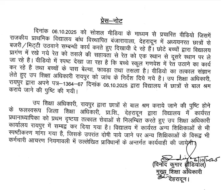 लोकजन एक्सप्रेस देहरादून l राजकीय प्राथमिक विद्यालय बांध विस्थापित बंजारावाला, देहरादून में छात्रों से बजरी, रेता, मिट्टी ढुलाई कराने संबंधी सोशल मीडिया पर प्रचारित वीडियो का संज्ञान लेते हुए मुख्य शिक्षा अधिकारी ने विद्यालय की प्रधानाचार्य को तत्काल प्रभाव से निलंबित करने का आदेश जारी किया। दरअसल 06 अक्टूबर को सोशल मीडिया के माध्यम से प्रचारित वीडियो जिसमें राजकीय प्राथमिक विद्यालय बांध विस्थापित बंजारावाला, देहरादून में अध्ययनरत छात्रों से बजरी/मिट्टी उठवाने सम्बन्धी कार्य करते हुए दिखायी दे रहे हैं। छोटे बच्चों द्वारा विद्यालय प्रांगण में रखे गए रेत को तसले की सहायता से रेत को एक स्थान से दूसरे स्थान पर ले जा रहे है। वीडियो में स्पष्ट देखा जा रहा है कि बच्चे स्कूल गणवेश में रेत उठाने का कार्य कर रहे है तथा बच्चों के पास बेल्चा, फावड़ा तथा तसला है। वीडियो का तत्काल संज्ञान लेते हुए मुख्य शिक्षा अधिकारी ने उप शिक्षा अधिकारी रायपुर को जांच के निर्देश दिए। उप शिक्षा अधिकारी ने विद्यालय में छात्रों से बाल श्रम कराए जाने की पुष्टि की गयी।उप शिक्षा अधिकारी, रायपुर द्वारा छात्रों से बाल श्रम कराये जाने की पुष्टि होने के फलस्वरूप जिला शिक्षा अधिकारी, प्रा.शि., देहरादून द्वारा विद्यालय में कार्यरत प्रधानाध्यापिका को प्रथम दृष्टया तत्काल सेवाओं से निलंबित करते हुए उप शिक्षा अधिकारी कार्यालय रायपुर में सम्बद्ध कर दिया गया है। विद्यालय में कार्यरत अन्य शिक्षिकाओं से भी स्पष्टीकरण मांगा गया है, जिसके उपरांत दोषी पाये जाने पर अन्य शिक्षिकाओं के विरुद्ध भी कर्मचारी आचरण नियमावली में उल्लेखित प्रावधानों के अंतर्गत कार्यवाही की जाएगी।