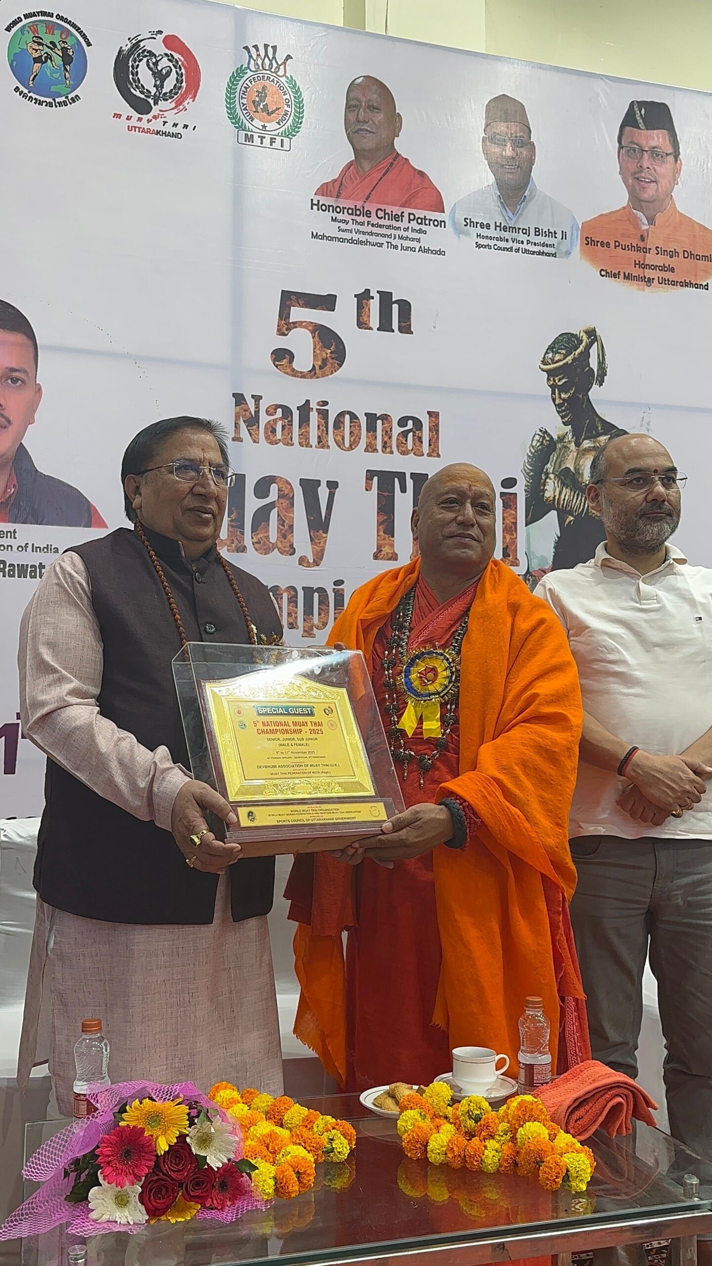 लोकजन एक्सप्रेस देहरादून l 5वीं राष्ट्रीय मुए थाई प्रतियोगिता का आयोजन 9 नवम्बर से परेड ग्राउंड, देहरादून में किया गया। इस प्रतियोगिता में 17 राज्यों के 700 से अधिक खिलाड़ियों ने पारंपरिक युद्ध कला के इस महा संगम में भाग लिया। प्रतियोगिता का उद्घाटन मुख्य अतिथि, राज्य सभा सांसद श्री नरेश बंसल जी द्वारा किया गया।प्रतियोगिता का समापन निर्णय पर सर्वाधिक स्वर्ण पदक अर्जित करने पर उत्तर प्रदेश की टीम ने पहला स्थान प्राप्त किया। दिल्ली की टीम ने दूसरा स्थान तथा मणिपुर और उत्तराखंड की टीम ने संयुक्त रूप से तीसरा स्थान प्राप्त किया।यह प्रतियोगिता मुवाय थाई फेडरेशन ऑफ़ इंडिया के तत्वाधान में आयोजित की हुई ।फेडरेशन के मुख्य संरक्षक, पूज्य स्वामी वीरेंद्रानंद महाराज महांडलेश्वर श्री जूना अखाड़ा,फेडरेशन के अध्यक्ष श्री अशोक रंधावा, फेडरेशन के उपाध्यक्ष श्री शेखर सुयाल जी,श्री नरेंद्र कुमार,नीरज उपाध्याय , आनंद चुफाल , दक्ष चुफाल,कुणाल चौधरी, के दिशा निर्देशन में सपन्न हुई। प्रतियोगता के कुशल आयोजन हेतु विशेष सहयोगी उपाध्यक्ष श्री शेखर सुयाल , उत्तराखंड मुआय थाई फेडरेशन के अध्यक्ष श्री भूपेश पंत, नैनी बेकरी देहरादून,प्राइड ऑफ़ हिमालय पिथौरागढ़ , आर आर काबेल और ग्रुप, आरोग्यधाम हॉस्पिटल देहरादून, के विशेष सहयोगों द्वारा प्रतियोगिता का समापन हुवा। प्रतियोगिता में श्री हेमराज बिष्ट जी उपाध्यक्ष खेल परिषद, श्री श्याम अग्रवाल राज्य मंत्री, विनोद रुहेला जी राज्य मंत्री,विश्वास डाबर जी,देवेंद्र बिष्ट जी, खेल निदेशक श्री आशीष चौहान जी,अप खेल निदेशक श्री संजीव पौड़ी जी,जिला क्रीड़ा अधिकारी देहरादून श्री रवींद्र भंडारी जी ने प्रतिभागियों को पदक देकर प्रतियोगिता का समापन किया।