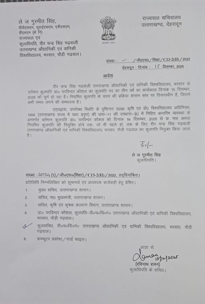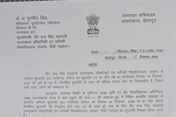 बता दें कि डा. परविन्दर कौशल का तीन वर्ष का कार्यकाल आज समाप्त हो गया था।नियमित कुलपति के चयन की प्रक्रिया शासन स्तर पर विचाराधीन है, जिसमें अभी समय लगने की संभावना है। इसे देखते हुए डा. परविन्दर को 16 दिसंबर से छह माह या नियमित कुलपति की नियुक्ति होने तक, जो भी पहले हो, तक के लिए भरसार विवि का कुलपति नियुक्त किया गया है।