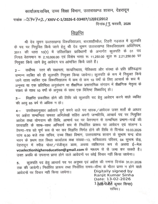 श्री देव सुमन उत्तराखंड विवि के वाईस चांसलर का कार्य काल 11अप्रैल 2026 को समाप्त हो रहा है इसके लिए शासन ने नए कुलपति की नियुक्ति के लिए विज्ञप्ति जारी कर ली है | श्री देव सुमन उत्तराखंड विवि राज्य का सबसे बड़ा विश्वविद्यालय है जिस में लगभग 200 से ऊपर सरकारी गैर सरकारी एवं निजी शिक्षण संस्थान सम्बद्ध है और लगभग 80 हजार छात्र – छात्रायें अध्यनरत हैं| ऐसे में सरकार ने छात्र छात्राओं के भविष्य को देखते हुए नए कुलपति की नियुक्ति में देरी न कर के तुरंत विज्ञप्ति जारी की है