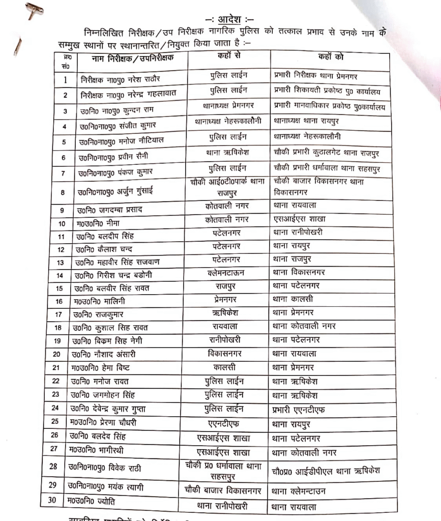 देहरादून SSP ने किया 3 थानाध्यक्ष समेत 30 अधिकारियों के तबादले