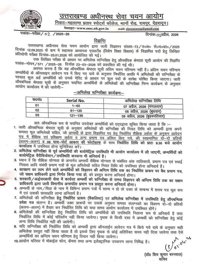 उत्तराखण्ड अधीनस्थ सेवा चयन आयोग द्वारा जारी विज्ञापन संख्या-73/उ०अ० से०च०आ०/2025 दिनांक 12.09.2025 के कम में सहायक अध्यापक एल०टी० (विशेष शिक्षा शिक्षक) के विज्ञापित पदों हेतु लिखित प्रतियोगी परीक्षा दिनांक-25.01.2026 को आयोजित की गई।