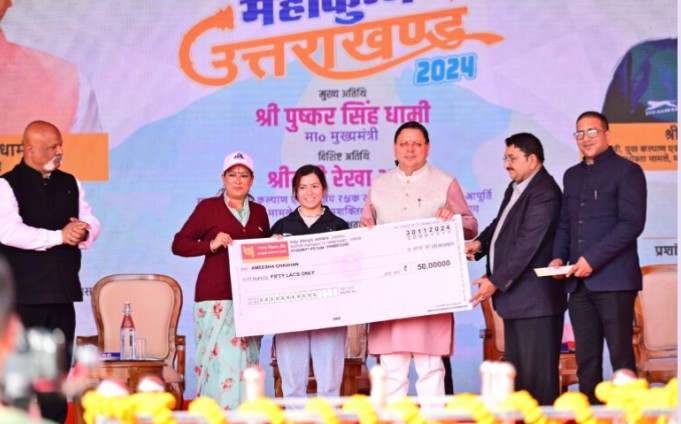 रविवार को युवा कल्याण निदेशालय में खेल महाकुंभ – 2024 की राज्य स्तरीय प्रतियोगिताओं का शुभारंभ करते हुए मुख्यमंत्री पुष्कर सिंह धामी ने उक्त घोषणाएं की हैं। उन्होंने इस अवसर पर डेफ ओलंपिक में स्कीइंग प्रतिभाग करने वाली खिलाड़ी अमीषा चौहान को 50 लाख की प्रोत्साहन राशि का चेक प्रदान किया। एथलेटिक्स में 27वीं नेशनल फेडरेशन में स्वर्ण पदक जीतने वाली सोनिया को 02 लाख और 22वें नेशनल फेडरेशन जूनियर में राहुल सरनालिया को स्वर्ण पदक जीतने पर 01 लाख रुपए का प्रोत्साहन राशि का चेक प्रदान किया।