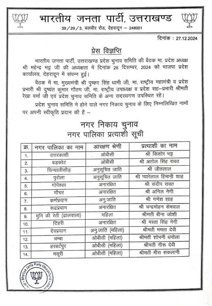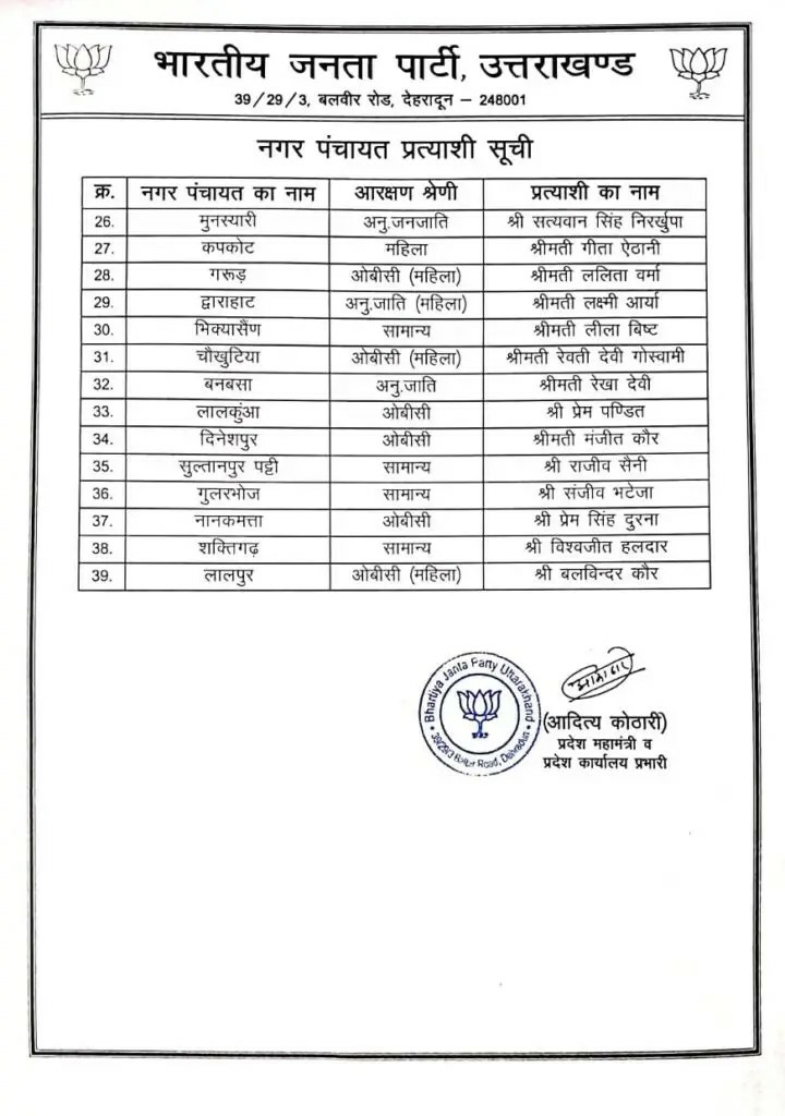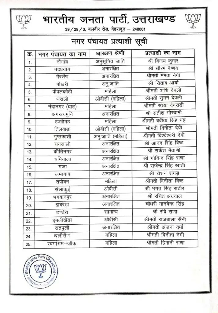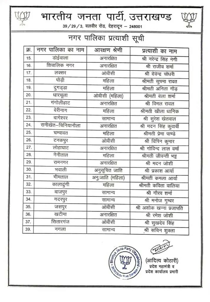 एक और प्रमुख पर्यटक स्थल नैनीताल की महिला आरक्षित सीट पर जीवन्ती देवी और मुख्यमंत्री की गृह सीट खटीमा (अनारक्षित) में रमेश जोशी को टेकट दिया गया। महिला सीट पौड़ी में सुषमा रावत को और रामनगर में मदन जोशी को Candidate बनाया गया। डोईवाला में नरेंद्र सिंह नेगी को उतारा गया।कई दिनों तक शीर्ष स्तर और CM पुष्कर संग मंथन के बाद BJP ने नगर पालिका और नगर पंचायत के प्रमुख पद प्रत्याशियों के नामों का ऐलान काफी सोच समझ कर किया। अब सभी की नजरें Mayor टिकटों की घोषणा पर टिकी है।