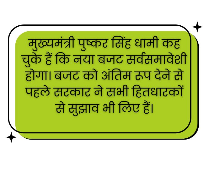 सूत्रों के अनुसार राज्यपाल के अभिभाषण के एक दिन बाद यानी 19 फरवरी को बजट प्रस्तुत किया जा सकता है। इस संबंध में अभी अंतिम निर्णय होना बाकी है। मुख्यमंत्री पुष्कर सिंह धामी कह चुके हैं कि नया बजट सर्वसमावेशी होगा। बजट को अंतिम रूप देने से पहले सरकार ने सभी हितधारकों से सुझाव भी लिए हैं।