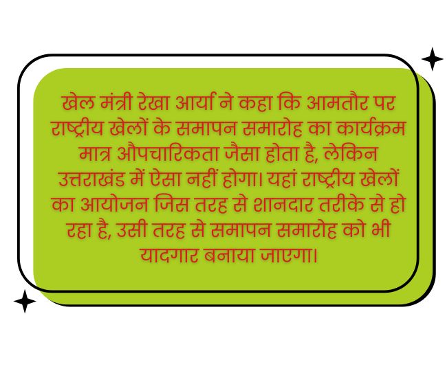इसके लिए हल्द्वानी के गौलापार स्टेडियम में 15000 से ज्यादा लोगों की बैठने की व्यवस्था बनाई जा रही है। उन्होंने बताया कि मुख्य कार्यक्रम शुरू होने से पहले कुमाऊंनी गायिका श्वेता मेहरा और दिगारी ग्रुप की प्रस्तुतियां होंगी। औपचारिक आयोजन समाप्त होने के बाद बॉलीवुड के गायक सुखविंदर प्रस्तुतियां देंगे।मानसखंड और गेम्स रीकैप को किया जाएगा प्रदर्शितखेल मंत्री रेखा आर्या ने कहा कि इस दौरान मानसखंड और गेम्स रीकैप को प्रदर्शित किया जाएगा। इसमें आयोजन शुरू होने से लेकर अंत तक क्या-क्या गतिविधियां हुईं, उनकी एक झलक देखने को मिलेगी। समापन समारोह में देश के सभी टीमों के एथलीट और रिकार्ड धारकों को भी सम्मानित किया जाएगा।