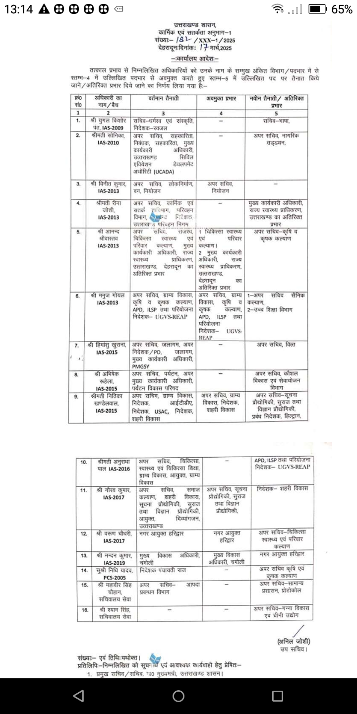 यह पदभार देख रहे आईएएस मनुज गोयल को अपर सचिव सैनिक कल्याण व उच्च शिक्षा विभाग का दायित्व दिया गया है। आईएएस हिमांशु खुराना को अपर सचिव वित्त का अतिरिक्त पदभार सौंपा गया है। आईएएस अभिषेक रुहेला को अपर सचिव कौशल विकास एवं सेवा योजन की जिम्मेदारी दी गई है।