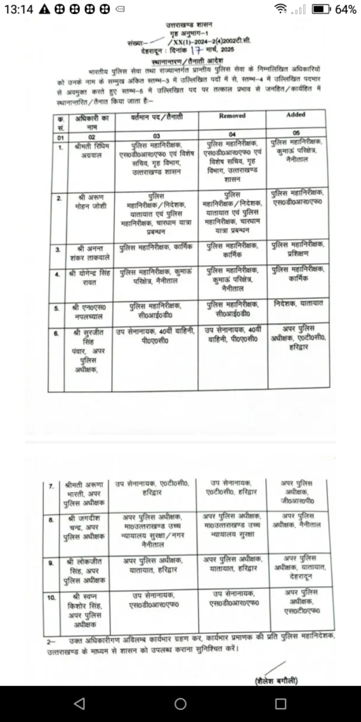- आईएएस व नगर आयुक्त हरिद्वार वरुण चौधरी को अपर सचिव चिकित्सा स्वास्थ्य एवं परिवार कल्याण का दायित्व दिया गया है। आईएएस नंदन कुमार को सीडीओ चमोली के पद से नगर आयुक्त हरिद्वार के पद पर तैनाती दी गई है।