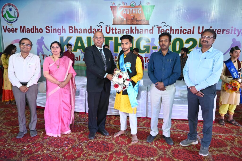 वीर माधो सिंह भंडारी उत्तराखंड प्रौद्योगिकी विश्वविद्यालय(यू.टी.यू.) में कल दिनांक 3 अप्रैल 2025 को शुरू हुए दो दिवसीय एथलेटिक्स एवं कल्चरल इवेंट ( कौथिक 2025) का आज दिनांक 4 अप्रैल 2025 को रंगारंग समापन हो गया है। उत्तराखंड तकनीकी विश्वविद्यालय के इस एथलेटिक्स एवं कल्चरल इवेंट कौशिक 2025 में विभिन्न संबद्ध संस्थाओं के अध्यनरत छात्र-छात्राओं द्वारा अलग-अलग प्रतिस्पर्धाओं में भाग लेकर अपने हुनर का परिचय दिया lविश्वविद्यालय के कुलपति प्रोफेसर ओंकार सिंह ने छात्र-छात्राओं को प्रोत्साहित करते हुए कहा कि अपने पढ़ाई के साथ-साथ खेलकूद एवं सांस्कृतिक गतिविधियों में भी बढ़-कर कर हिस्सा लेने का प्रयास करना चाहिए जिससे उनको बौद्धिक एवं मानसिक रूप से सशक्त बनाए जाने में महत्वपूर्ण भूमिका हो सकती हैविश्वविद्यालय के कुलपति प्रो ओंकार सिंह द्वारा विभिन्न प्रतियोगिताओं में उत्कृष्ट प्रदर्शन करने वाले छात्रों को पुरस्कृत किया गया। कुलपति ने विगत 2 वर्ष पहले प्रारंभ किए गए विश्वविद्यालय के इस वार्षिक उत्सव के सफलता पूर्वक आयोजित होने पर प्रदेश भर की संस्थाओं को बधाई देते हुए इसी प्रकार लगातार वार्षिक उत्सव में छात्रों को अपनी प्रतिभा प्रदर्शित करने के अवसर प्रदान करने का आव्हान किया। इस वर्ष विश्वविद्यालय के परिसर और संबंध 45 संस्थाओं के लगभग 1400 छात्र छात्राओं ने 10 खेलकूद की, तीन तकनीकी और 15 सांस्कृतिक प्रतियोगिताओं का आयोजन किया गया। कुलपति ने छात्रों को अपने दृष्टिकोण को सकारात्मक रखने, सृजनात्मक क्षमता, तथा मूल्यों के साथ अपने विकास करने की सलाह दी। प्रतिभागियों को स्व अनुशासन के साथ अपने परिवेश से सामंजस्य रखते हुए सर्वांगीण विकास हेतु विश्वविद्यालय के शैक्षणिक प्रक्रियाओं तथा कार्यक्रमों का भरपूर लाभ लेने की अपेक्षा की।हाई जंप प्रतियोगिता में छात्रों में प्रथम स्थान विख्यात राणा जेबीआईटी, द्वितीय स्थान योगेश सिंह बिष्ट आईटी गोपेश्वर, और तृतीय स्थान श्रीकांत थपलियाल फैकेल्टी आफ टेक्नोलॉजी ने प्राप्त कियाl वहीं छात्राओं में प्रथम स्थान दर्शित नौटियाल महिला प्रौद्योगिकी संस्थान देहरादून, द्वितीय स्थान नितिक्षा रावत जीआरडी, तृतीय स्थान दिव्या महिला प्रौद्योगिकी संस्थान देहरादून ने प्राप्त कियाlस्पोर्ट फुट प्रतियोगिता में छात्रों में प्रथम स्थान रमेश हरण एसडीबीआईटी, द्वितीय स्थान विख्यात जेबीआईटी, तृतीय स्थान अक्षित शर्मा जीबीपीईआईटी घुरदौरी पौड़ी ने प्राप्त कियाl वहीं स्पोर्ट फुट प्रतियोगिता में छात्राओं में प्रथम स्थान प्रेरणा कुमारी जेबीआईटी, द्वितीय स्थान दीपिका रतूड़ी महिला प्रौद्योगिकी संस्थान, तृतीय स्थान सौम्या सिंघल फैकल्टी ऑफ़ टेक्नोलॉजी ने प