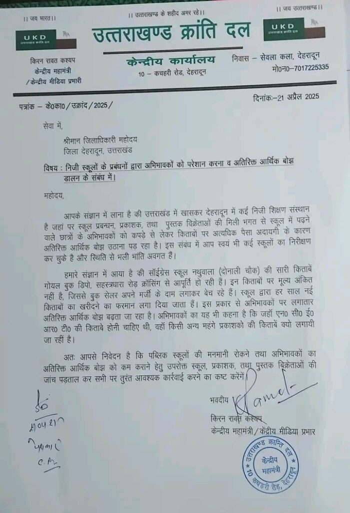 लोकजन एक्सप्रेस देहरादून बीते दिवस उत्तराखंड क्रांति दल के जनसुनवाई शिविर में आई हुई समस्या के विषय में केंद्रीय महामंत्री किरन रावत के नेतृत्व में निजी स्कूलों द्वारा अभिभावकों पर अतिरिक्त आर्थिक भार डालने के संबंध में जिलाधिकारी देहरादून को ज्ञापन दिया गया l ज्ञापन सिटी मजिस्ट्रेट द्वारा लिया गया l किरन रावत ने कहा की देहरादून में बहुत से निजी शिक्षण संस्थान है जहां पर स्कूल प्रबंधन ,प्रकाशक तथा पुस्तक विक्रेताओं की मिली -भगत से स्कूल में पढ़ने वाले छात्रों के अभिभावकों को कपड़ों से लेकर किताबों तक अत्यधिक पैसा देने के कारण अतिरिक्त आर्थिक भार उठाना पड़ रहा है l इस संबंध में जिलाधिकारी महोदय द्वारा स्वयं भी कई स्कूलों का निरीक्षण किया गया तथा मान्यता रद्द की गई l उन्होंने कहां की साईं ग्रेस स्कूल नथुवाला दोनाली चौक की सारी किताबें “गोयल बुक डिपो” सहस्त्रधारा क्रॉसिंग से आपूर्ति की जा रही है l इन किताबों पर मूल्य अंकित नहीं है l जिससे बुक सेलर अपनी मर्जी के दाम लगाकर किताबें बेच रहे हैं l स्कूल द्वारा हर साल नई किताबों को खरीदने का फरमान लगा दिया जाता है l इस प्रकार से अभिभावकों पर लगातार आर्थिक भार बढ़ता जा रहा है l अभिभावकों का यहां तक कहना है कि जहां एनसीईआरटी की किताबें होनी चाहिए वहां किसी अन्य महंगे प्रकाशकों की किताबें क्यों लगवाई जा रही है l यदि अभिभावकों के पास पिछले वर्ष की किताबें उपलब्ध है तो एक दो किताबों के लिए उन्हें पूरा सेट खरीदने के लिए बाध्य किया जा रहा है l उन्होंने कहा की पब्लिक स्कूलों की मनमानी रोकने तथा अभिभावकों का अतिरिक्त आर्थिक भार कम करने के लिए जिलाधिकारी महोदय को उक्त स्कूल, प्रकाशक तथा पुस्तक विक्रेताओं की जांच पड़ताल कर सभी पर तुरंत आवश्यक कार्यवाही करनी चाहिए l सिटी मजिस्ट्रेट देहरादून ने ज्ञापन लेने के तुरंत बाद ही उक्त पुस्तक विक्रेता को फोन से कॉल करके सारी स्थिति का संज्ञान लिया तथा अभिभावकों को विश्वास दिलाया कि वह जाकर किताबें खरीद सकते हैं तथा यदि किताबें की खरीदारी में कोई परेशानी आती है तो वह वहीं से फोन पर हमारी बात करवा दीजिए l ज्ञापन प्रेषित करने वालों में वरिष्ठ नेता आंदोलनकारी ल ताफत हुसैन, अधिवक्ता एस एन बिष्ट ,अधिवक्ता कौशल कुमार, मनीष रावत, जितेंद्र तथा वीरेंद्र रावत आदि उपस्थित रहे l